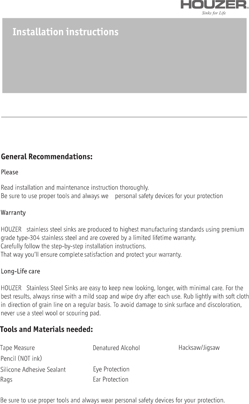 HOUZER Inc. 2605 Kuser Road, Hamilton, NJ 08691 Ph.1.800.880.3639 F. 1.609.584.1930 www.HouzerSink.
