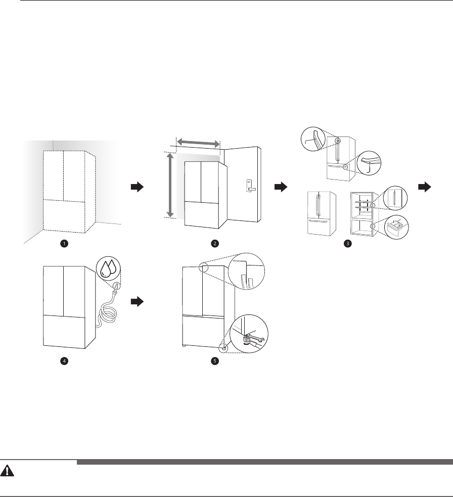 2 INSTALLATION INSTALLATION Before Installing Installation Overview Please read the following installation instructions first after purchasing this product or transporting it to another location. a Unpacking the Refrigerator b Choosing the Proper Location c Disassembling/Assembling d Connecting the Water Line e Leveling and Door Alignment CAUTION • Connect to potable water supply only.