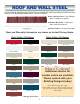 ROOF AND WALL STEEL We use 29 gauge industrial quality full hard steel. All Colored steel roofing and siding is fastened with color matched 1 1/2” long powder coated screws - no paint to chip off. Low Lifecycle Costs - No Siding to paint or shingles to replace. Weather Resistant - Holds up to snow, wind, hail and sun. Green Product - Energy Star Rated Steel and Warranty Information are shown on Instant Pricing Quote. Steel Colors 26 Gauge Steel Colors 29 Gauge *Brite Red Black *White *Lt.