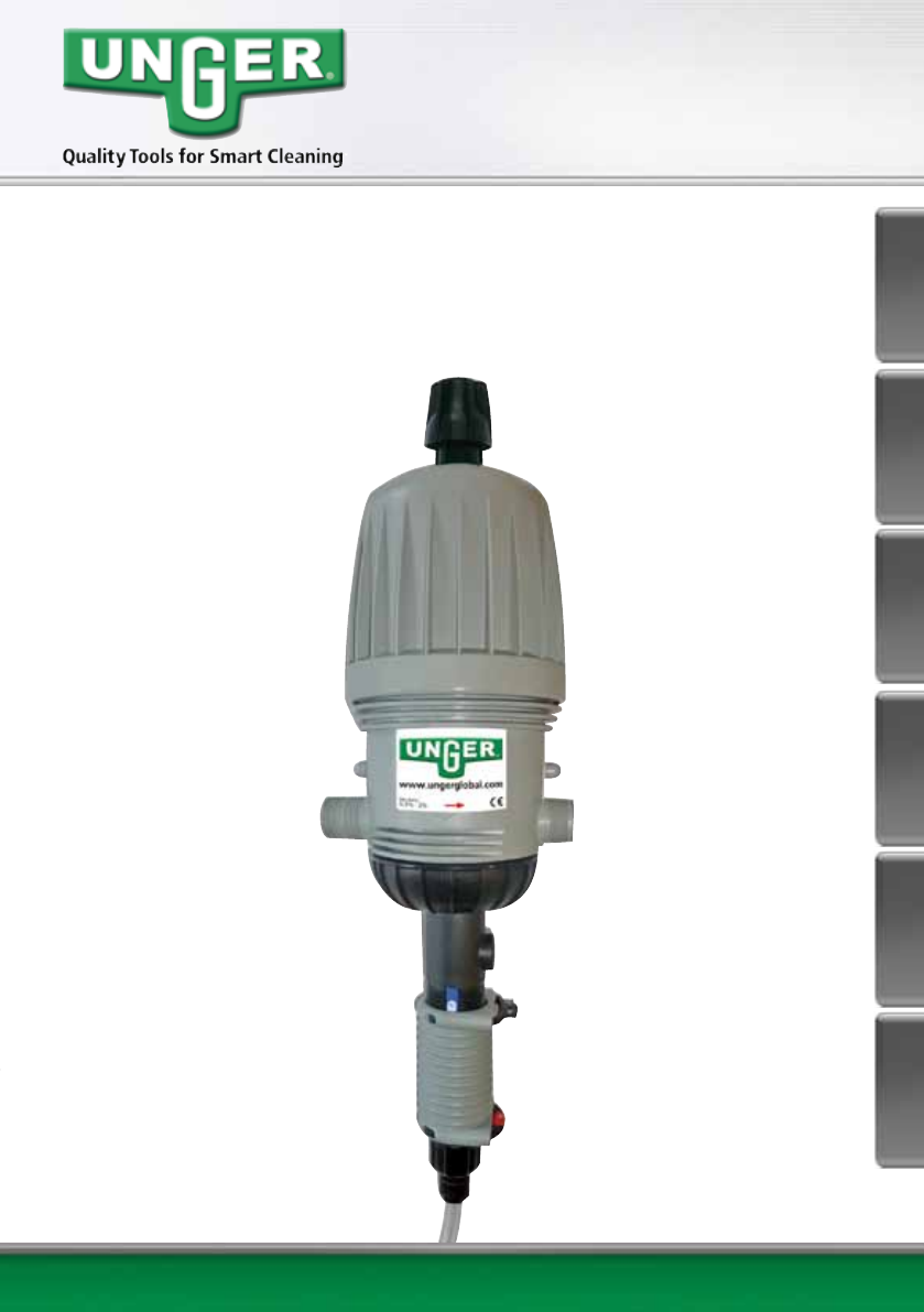 HiFlo™ zeeppomp Snelstarthandleiding Hartelijk dank, dat u gekozen hebt voor de Unger HiFlo™ zeeppomp. Deze korte handleiding helpt u het systeem juist te installeren en snel te gebruiken. 1. Ingebruikname Deze zeeppomp wordt alleen met water aangedreven, er is geen stroom nodig. Sluit de zeeppomp in de waterstroom (pijlrichting) tussen uw zuiver water-filter en uw watersteel aan, om reinigingsmiddel ter ondersteuning van de oppervlaktereiniging toe te voegen. 1.