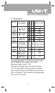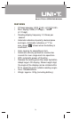 Model UT2000: OPERATING MANUAL ALARM SOUNDS 2001 2002/5 2006 2007 2003 2004 13. Alarm Switch positionTest leads position MisV, ,Hz, , A or 10A BATT operation 10A A,mA,2A A 10A Over Display >19999* range The testing value for range is meaningless. 14. Square wave output Frequency approx. 50Hz, range Vp-p 2V (only for UT2001). OPERATING INSTRUCTIONS 1. Check the 9V battery by press down the ON - OFF SWITCH. If the battery is weak,” “ sign will appear on left bottom side of the display.