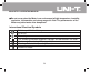 Model UT211: OPERATING MANUAL Number Symbol Meaning 6 OL Indicator for overloading 7 Auto The Meter is in the auto range mode in which the Meter automatically selects the range with the best resolution. The battery is low. Warning: To avoid false readings, which could lead to possible electric shock or personal injury, replace the battery as soon as the battery indicator appears. 8 9 ,k ,M Ohm. The unit of resistance. Kilohm. 1 x 103 or 1000 ohms. Mega ohm. 1 x 106 or 1,000,000 ohms. V Volts.