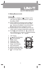 Model UT57: OPERATING MANUAL F. Using Holster Three different ways to use holster: 1) Set holster parallel on the table, do not open the tilt stand (see diagram 1) 2) Set holster in a small angle on the table, tilt it up by the first part of tilt stand (see diagram 2) 3) Set holster in a large angle on the table, tilt it up by all two parts of tilt stand (see diagram 2). figure1 figure2 figure3 G. Using Strap 1) Put the front end of the strap through the round metal of the Meter, see diagram 1.