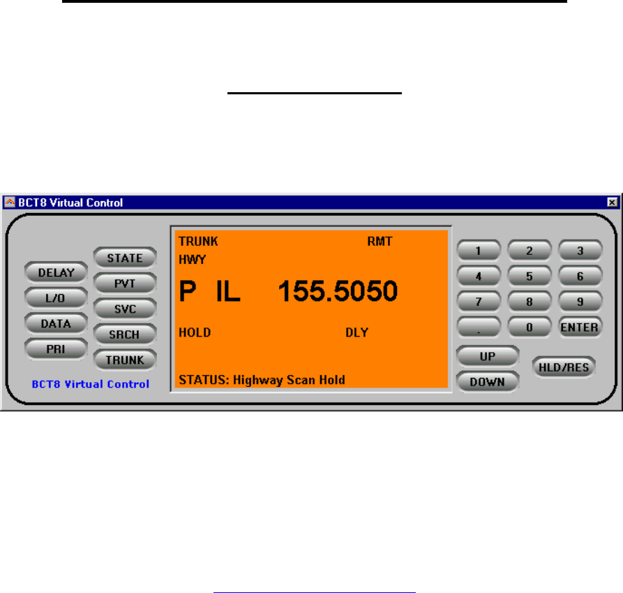 6 Virtual Control ARC8 includes a virtual control option. 6.1 Virtual Control: Keyboard The keyboard tab gives you direct control over the BCT8. The display includes a status option where you can directly check the current status of you scanner. Some buttons support the right mouse button click: PRI: right click for setting a priority L/Oock Out: right click for clearing all lockout channels / frequencies / id's (depends on scanner status mode).