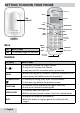 Getting to Know Your Phone Earpiece Status FIND HANDSET Display UP CLEAR PHONEBOOK/ LEFT TALK/ FLASH Key FinD What it does xxIn standby: page the handset. Handset Key (icon) CALLER ID/LEFT END DOWN Twelvekey dial pad CHARGING CONTACTS Base MENU/SELECT REDIAL/ PAUSE MUTE MESSAGES Microphone Charging contacts What it does xxIn standby: increase the ringer volume. xxDuring a call: increase the volume. Up ( ) xxIn any menu or list: move the cursor up one line.