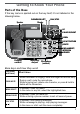 Getting to Know Your Phone Parts of the Base If the key name is spelled out on the key itself, it's not labeled in the drawing below. PHONEBOOK/LEFT PLAY/STOP Display Speaker UP CALLER ID/RIGHT DOWN DO NOT DISTURB DELETE FIND HANDSET/ INTERCOM SPEAKER Charging contacts Twelve-key dial pad Microphone (on back) Base keys and how they work Key name (and icon) What it does clear/mute - While this station is ringing: mute the ringer for this call only. - During a call: mute the microphone.
