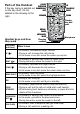 Getting to Know Your Phone Parts of the Base If the key name is spelled out on the key itself, it's not labeled in the drawing below. PHONEBOOK/LEFT Hook switch PLAY/STOP Display Handset clip UP CALLER ID/RIGHT DOWN DO NOT DISTURB DELETE Speaker FIND HANDSET/ INTERCOM Twelve-key dial pad SPEAKER Microphone (on back) Base keys and how they work Key name (and icon) What it does clear/mute - While this station is ringing: mute the ringer for this call only. - During a call: mute the microphone.