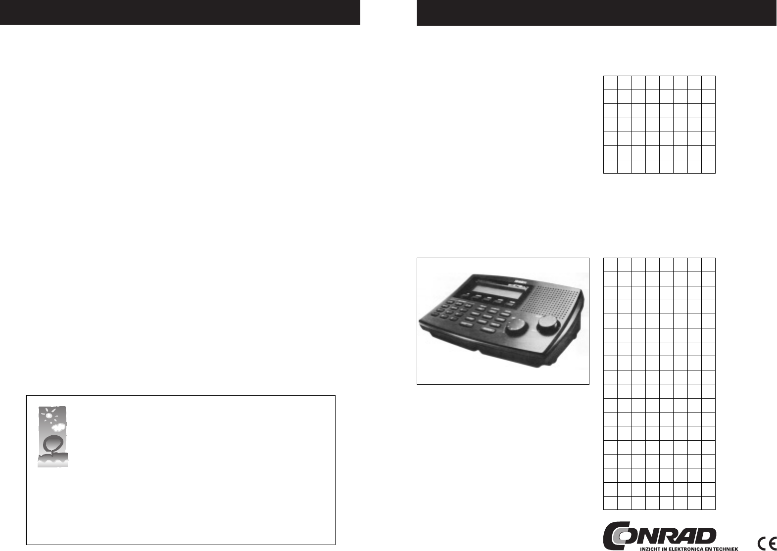 1. 2. Vloeibaar kristallen display of kort LCD genoemd (voor Liquid Crystal Display). Weergave van de tijd, de ontvangstfrequentie, het kanaal en de functies. Numeriek toetsenbord voor het invoeren van getallen. Hiermee wordt de programmering voor de kanalen ingevoerd die later gescand kunnen worden. Eveneens kunt u de kanalen (frequenties) direct invoeren (in verbinding met de toets “MANUAL”).