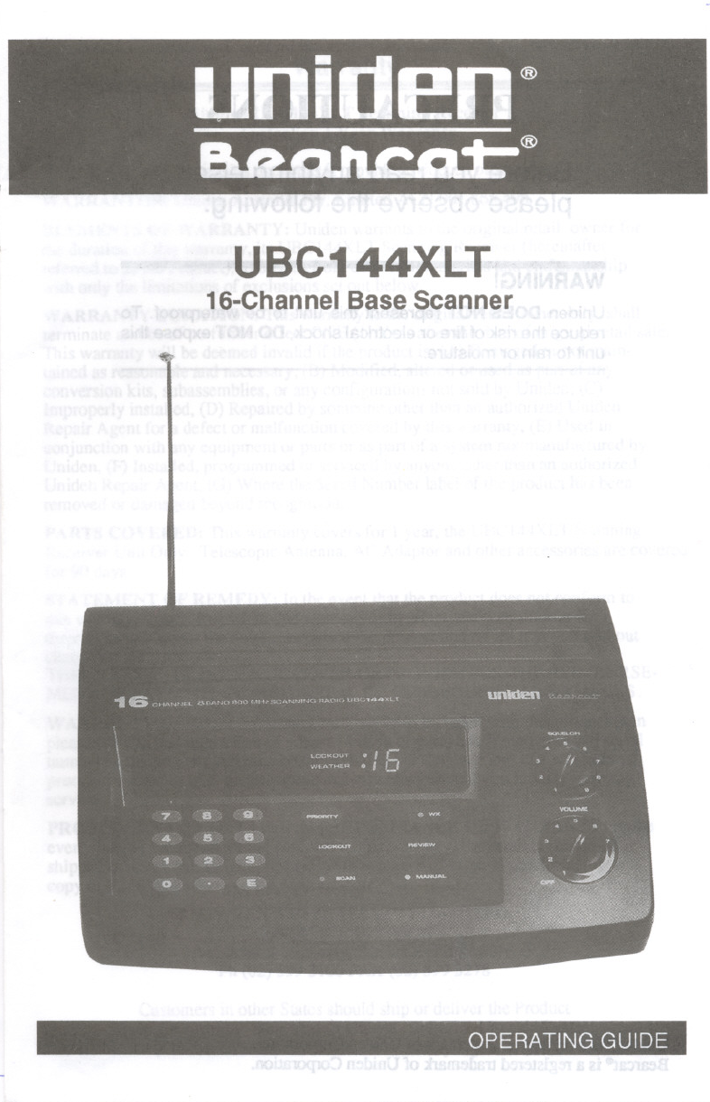 --~ I Table of Contents Introduction AboutScanning TakingProperCareofYourScanner Unpacking 2 3 3 Installation InstallingtheUBC144XLT 4 Operation ControlsandFunctions ScanningOverview Getting Started AdjustingtheSquelch Programming Tips Programming Frequencies AboutMemoryBack-up Scanning Direct Channel Access CheckingtheProgrammedFrequency WeatherChannelScan Priority Scanning ChannelLockout 5 7 7 8 8 9 9 10 10 11 11 12 12 About the Unit HelpfulHints Troubleshooting TechnicalSpecifications Warranty 1