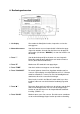 8. Bedieningselementen 1 LC-display Hier worden de kloktijd, de kanalen, frequenties en functies weergegeven. 2 Numerieke toetsen Voor het invoeren van een frequentie die in 50 kanalen opgeslagen kan worden; alsmede voor het kiezen van de opgeslagen kanalen (via de toets "MANUAL") en voor het invoeren van de kloktijd. 3 Toets "." Voor de decimale punt bij het invoeren van een frequentie. Bovendien wordt de toets gebruikt om een foutieve invoer te wissen (toets tweemaal indrukken).