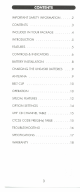 CONTENTS IMPORTANT SAFETY INFORMATION.. . . . .2 CONTENTS 3 INCLUDEDIN YOUR PACKAGE. . . . . . . . .4 INTRODUCTION 5 FEATURES 5 CONTROLS & INDICATORS.. . . . . . . . . . .6 BATTERY INSTAllATION. . . . . . . . . . . . . .8 CHARGING THE UH045XR BATTERIES. . . .9 ANTENNA 9 BElTCLlP 10 OPERATION 10 SPECIAlFEATURES 12 OPTION SETTINGS 14 UHFCB CHANNELTABLE.. . . . . . . . . . .15 CTCSSCODEFREQ(Hz) TABLE.. . . . . . . .
