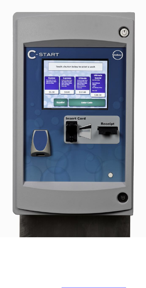 C-START 1 Introduction The C-Start is touch-screen based car wash payment system that is designed to work at any in-bay automatic or conveyor and is perfect for convenience stores (C-store) or any car wash that does not wish to accept cash as payment. This Owner’s Manual describes the programming features and provides information on daily operations and recommended maintenance. For detailed information on how to install the C-Start and for networking information, please see the CStart Installation Manual.