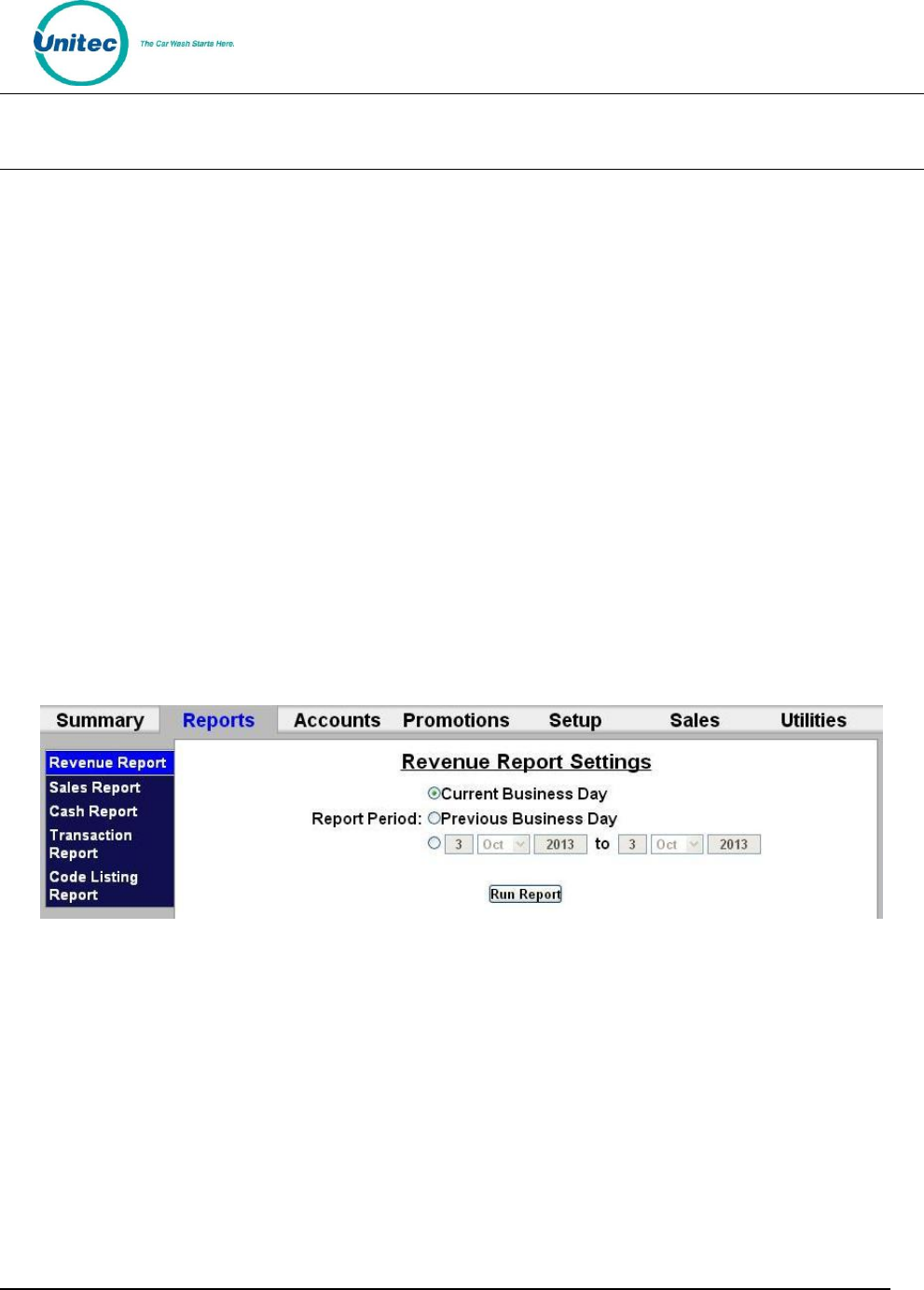 Revenue reports can be generated for the current business day, previous day or for a user specified date