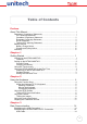 Appendix B Worldwide Support Unitech’s professional support team is available to quickly answer questions or technical-related issues. Should an equipment problem occur, please contact the nearest Unitech regional service representative. For complete contact information please visit the Web sites listed below: Region Web Site Global Operation Center www.unitech-adc.com Unitech Asia Pacific & Middle East www.unitech-utp.com.tw Greater China Division www.unitech-sbd.com Unitech Japan www.