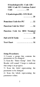 Code 39: F1 0/1 4 5 6 7/8 0~48 Disable/Enable 2/3 Full ASCII/Standard Check Digit Calculate and Send Check Digit Calculate but Not Send Check Digit Not Calculate Send/Not Send Start & Stop Min 0 / Max 48 Interleaved 2 of 5: 0/1 2/3 4 5 6 7 8 9 4~64 F2 Disable/Enable Fix Length On/Off (by first three reads) Check Digit Calculate and Send Check Digit Calculate but Not Send Check Digit Not Calculate First Digit Suppressed. Last Digit Not Suppressed. Not Suppressed.