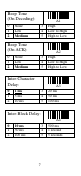Beep Tone (On Decoding): 0 1 2 None Low Medium 3 4 5 A1 High Low to High High to Low 3 4 5 A2 High Low to High High to Low 3 4 5 A3 20 ms 50 ms 100 ms 3 4 5 A4 500 ms 1 second 5 seconds Beep Tone (On ACK): 0 1 2 None Low Medium Inter-Character Delay: 0 1 2 1 ms 5 ms 10 ms Inter-Block Delay: 0 1 2 10 ms 50 ms 100 ms 7