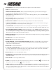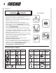 8. Hold drum (A) firmly and turn spool (B) CCW (counterclockwise) until it stops. DO NOT push in on spool when turning. B A 9. Pull both lines out and trim to cut-off knife length. SHARPENING METAL BLADES Three styles of metal blades are approved for use on the ECHO Brush Cutter. The 8-tooth blade can be sharpened during normal maintenance. The clearing blade and 80 tooth blade require professional service.