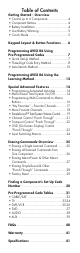 Table of Contents Getting Started - Overview • Control up to 6 Components ......................4 • Component Buttons ...................................4 • Battery Installation .....................................4 • Low Battery Warning .................................5 • Couch Mode ............................................5 Keypad Layout & Button Functions........6 Programming AVEX R6 Using Pre-Programmed Codes .........................7 • Quick Set-Up Method ................................