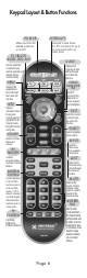 Keypad Layout & Button Functions POWER SYSTEM OFF Allows you to turn the selected component on and off. Designed to send Power On/Off commands for up to six components with one button press. TV, CBL,VCR, AUDIO, DVD, AUX GUIDE Used to select the component you want to operate and signals remote control activity. Displays the Program Guide listings through the Cable Set Top Box. CURSOR NAVIGATION PAD MENU Displays the Applications Menu through the Cable Set Top Box.