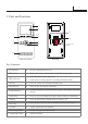 1 1. Parts and Functions 1 2 7 11 3 4 2 12 8 9 TALK MONITOR MENU 5 6 AT16 hasn’t this terminal. 10 AT16 or C5-AT16 back view Key Functions 1. Microphone ●● Receives sound from the user. 2. LCD screen ●● Display the images from outdoor station.Touch operation. 3. LED indicator ●● ●● Normally light on when power on Flash when receiving signal or activating No disturb mode 4. Call key ●● Press to activate the intercom function page. 5.