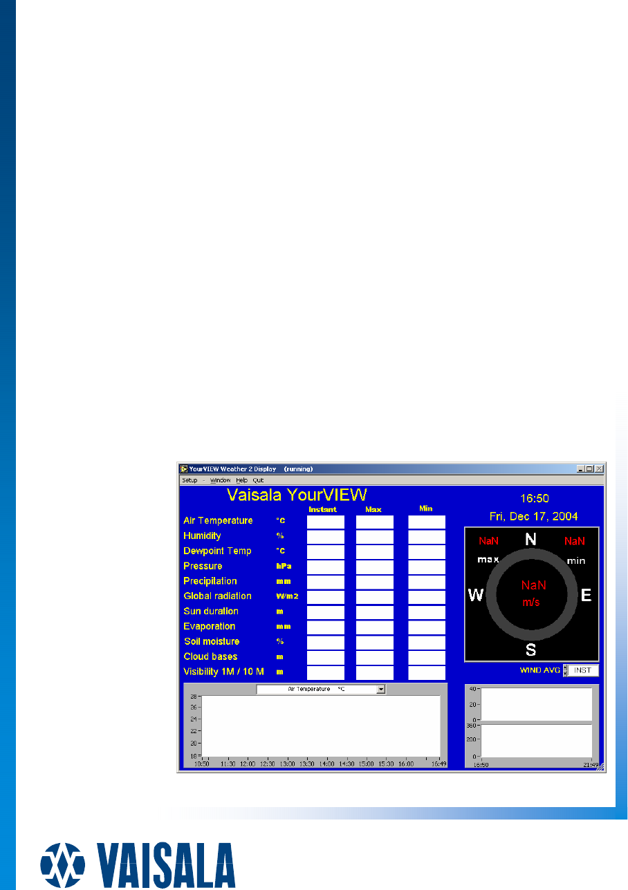User's Guide ______________________________________________________________________ The date and time on the Weather Display are the same as on your computer. The Display includes fields for air temperature, humidity, dew point temperature, pressure, solar, precipitation sum, etc. The contents of the data field depend on the configuration of the reports sent by MAWS or MILOS520. The text field titles are editable. A history window plots the previously received values for the selected sensor.