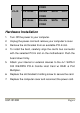 CON3 J5-J8 1-2 close Enable SATA Port SATA Port CON2 2-3 close Enable CON4 Hardware Installation 1. Turn Off the power to your computer. 2. Unplug the power cord and remove your computer’s cover. 3. Remove the slot bracket from an available PCI-E slot. 4. To install the bard, carefully align the card’s bus connector with the selected PCI-E slot on the motherboard. Push the board down firmly. 5.