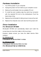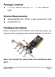 Hardware Installation 1. Turn Off the power to your computer. 2. Unplug the power cord and remove your computer’s cover. 3. Remove the slot bracket from an available PCI slot. 4. To install the card, carefully align the card’s bus connector with the selected PCI slot on the motherboard. Push the board down firmly. 5. Replace the slot bracket’s holding screw to secure the card. 6. Replace the computer cover and reconnect the power cord.