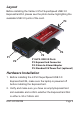 Layout Before installing the Vantec 2-Port SuperSpeed USB 3.0 ExpressCard/34, please see the photo below highlighting the available USB 3.0 ports of the card. P5 P1 P2 P3 P4 P1 & P2: USB 3.0 Ports P3: ExpressCard Connector P4: 34mm to 54mm Adapter P5: Standard 5V Power Port (optional) Hardware Installation 1. Before installing the 2-Port SuperSpeed USB 3.0 ExpressCard/34, make sure the laptop is powered off before installing the ExpressCard. 2.