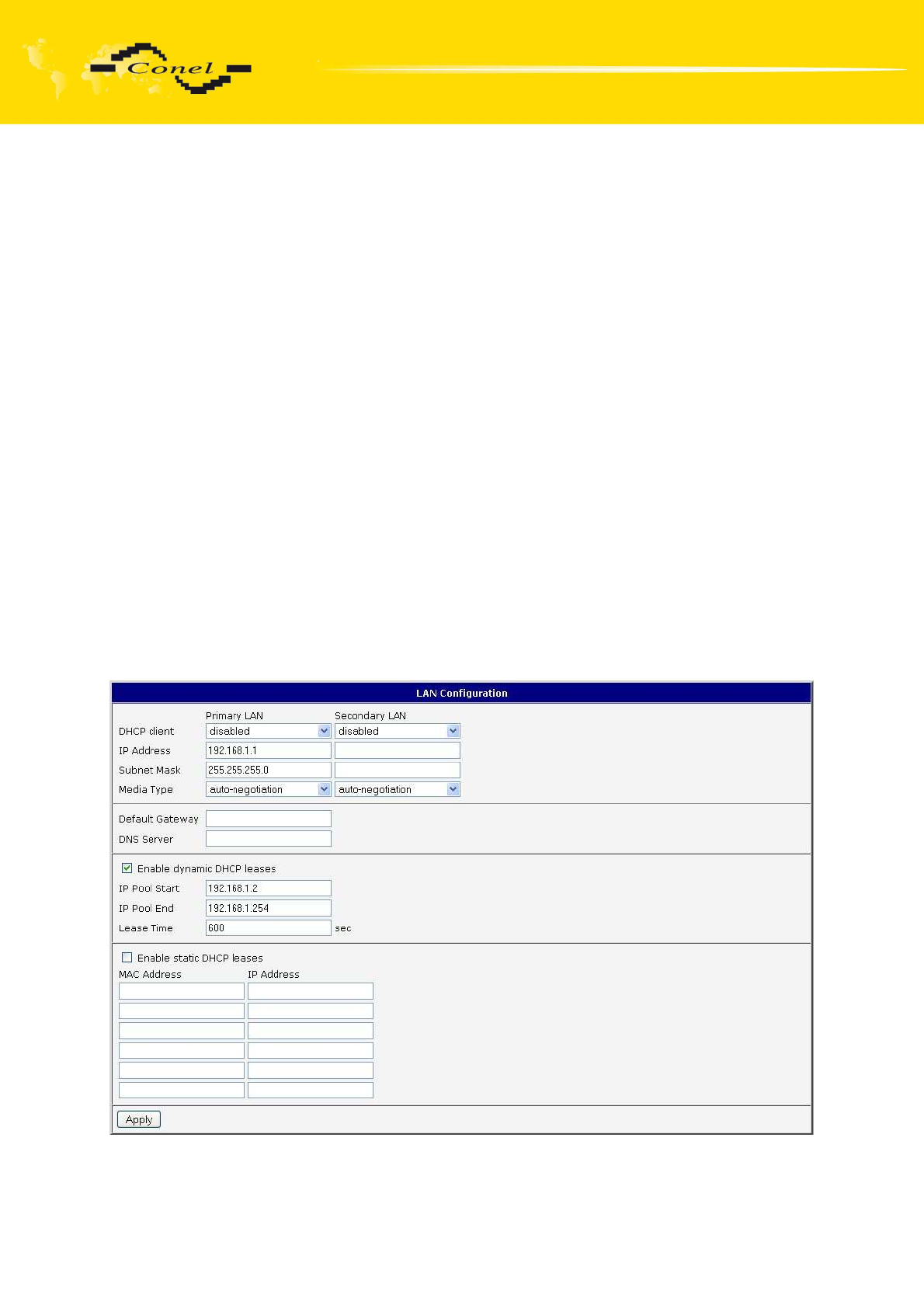 DHCP server option, to define leases up to six static IP Addresses, which conform to MAC