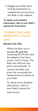 3. Engage your flash unit’s locking mechanism to stabilize the unit and lock the flash to the adapter. To obtain more detailed information, refer to your flash’s manual for instructions. CONNECTING AND REMOVING A FLASH UNIT [Models CCS, PSS] While the flash unit is mounting foot firmly onto the adapter’s hot shoe mount, until it stops. The flash unit will lock into place automatically. To remove the flash unit, press the mounting foot release button located on your flash.