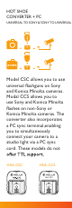 HOT SHOE CONVERTER + PC UNIVERSAL TO SONY & SONY TO UNIVERSAL Model CSC allows you to use universal flashguns on Sony and Konica Minolta cameras. Modal CCS allows you to use Sony and Konica Minolta flashes on non-Sony or Konica Minolta cameras. The converter also incorporates a PC sync terminal,enabling you to simultaneously connect your camera to a studio light via a PC sync cord.