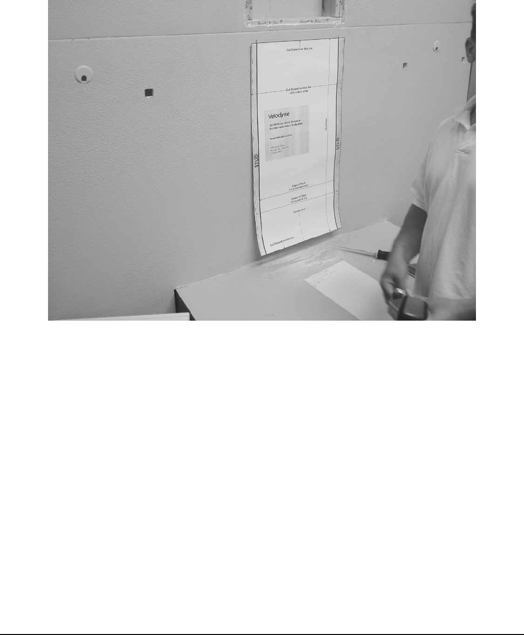 is secured to the wall with either staples or tape, score the drywall along the lines as detailed on the template.