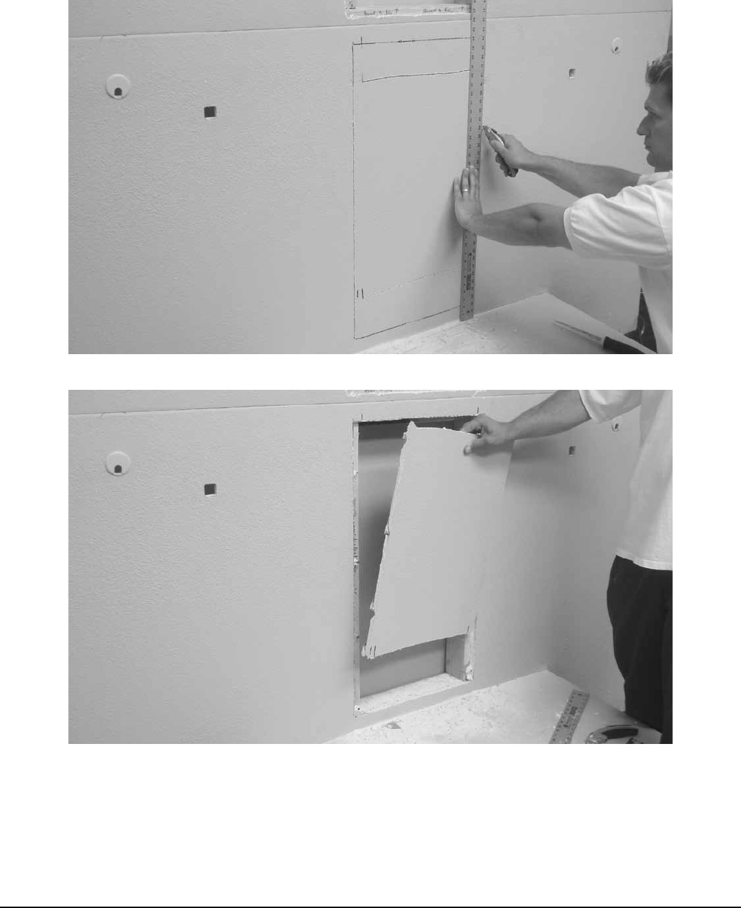 After the drywall is scored, remove the template and the drywall as indicated. The cutout after removal is shown