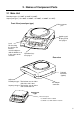 2. Names of Component Parts 2.1 Main Unit Round-pan types (SJ-220E, SJ-420E, SJ-620E) Square-pan types ( SJ-1200E, SJ-2200E, SJ-4200E, SJ-6200E, SJ-12KE) Front View (round-pan type) Measurement pan Liquid-crystal display (LCD) See page 6. Level For checking the level of the balance Turn the adjusters until the bubble rests in the center of the red circle. Operation keys See page 7.