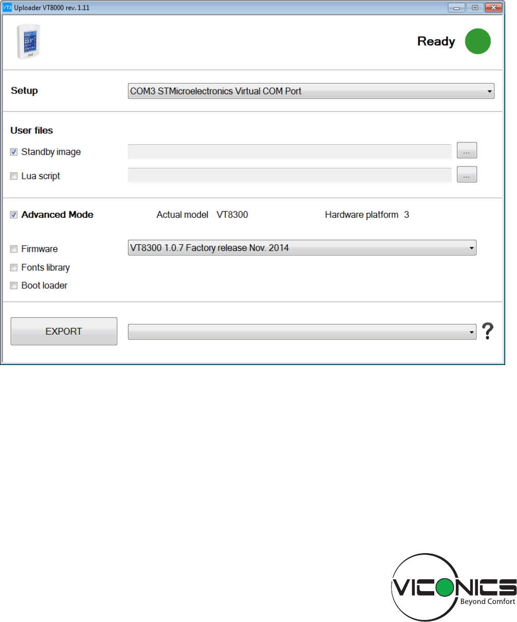 Uploader VT8000 Tool Install Guide 5 VT8000 Series Start Export This procedure shows you how to export a Standby Image, Lua script, or Firmware upgrade to the Room Controller. After a successful export, the drop-down list shows a log of the steps of the export process. If there is a problem, the list identifies step where the process failed (refer to Figure 5). CAUTION: ensure connecting cable is snugly plugged in both Room Controller and Device where Uploader VT8000 is installed.