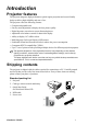 7DEOH RI FRQWHQWV ,QWURGXFWLRQ 3URMHFWRU IHDWXUHV 6KLSSLQJ FRQWHQWV 3URMHFWRU H[WHULRU YLHZ &RQWUROV DQG IXQFWLRQV