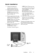 Quick Installation 1 2 Connect the monitor and computer power cords to a properly grounded AC outlet. Connect the video cable from your monitor to your computer. NOTE: Macintosh users may need an adapter. (See Customer Support on page 12.) 3 4 Turn on your monitor, then your computer. This sequence (monitor before computer) is important. NOTE: Windows 95, 98 or 2000 users may receive a message asking them to install the INF file. This is on the CD. Insert the ViewSonic Wizard CD.