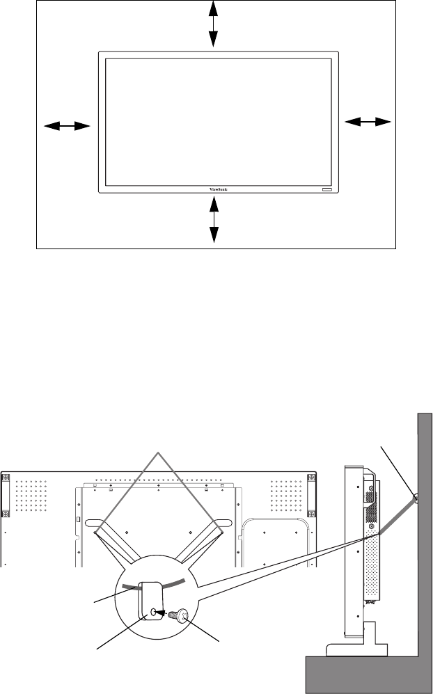 Como se muestra en la imagen, asegure el monitor a una pared sólida o una columna utilizando una