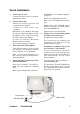 Quick Installation 1. Connect power cord CD-ROM drive, see “Customer Support” on page 14. Connect the power cord to a properly grounded AC outlet. 2. Wait for the CD-ROM to auto-start. Note : If the CD-ROM does not autostart: Connect video cable • Make sure both the monitor and computer are turned OFF. double-click on the CD-ROM icon in Windows Explorer, and then doubleclick on viewsonic.exe. • Con ne ct t he v ideo cable t o t he computer.