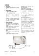 疑難排解 無電力 ‧ 請確認電源按鈕(或開關)在開啟狀態。 ‧ 請確認交流電源線已穩固連接到顯示器背面和電源插座。 ‧ 請先將另一臺電器裝置(例如收音機等)插接至電源插座,以確認插座供電正 常。 電源開啟,但無畫面影像 ‧ 請確認顯示器隨附的視訊纜線,已穩固地連接於電腦背面的視訊輸出埠上。如果 視訊纜線的另一端沒有與顯示器穩固地連接,請將其穩固地連接到顯示器。 ‧ 調整亮度和對比。 ‧ 驗證繪圖卡和顯示器之間,是否需要視訊轉接器(如果您使用比 G3 舊的 Macintosh 電腦,則需要 Macintosh 轉接器)才能獲得正常的訊號。 閃爍 ‧ 電力不足。請將顯示器連接到其他電源插座。如果使用了電源保護器,請減少插 接電器的數量。 ‧ 從主功能表中選擇 ViewMeter 以驗證垂直更新頻率為 75 Hz 以上。請參閱第 12 頁 上的「規格」。 ‧ 請移除顯示器四周所有會產生磁場的裝置,如收音機、電源保護器、非屏蔽式喇 叭、日光燈、交流電源轉換器與桌上型電扇等。 ‧ 請確認電腦中的繪圖卡可以在需要的頻率下,使用非交錯模式。若要讓您的繪圖 卡支援更高的垂直更新頻率,請試著選擇較少色彩或執行較低的解析度。 色