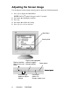 Using Your Monitor Setting the Timing Mode Setting the timing mode is important for maximizing the quality of the screen image and minimizing eye strain. The timing mode consists of the resolution (example: 1280 x 1024) and refresh rate (or vertical frequency, example: 75 Hz). For the best picture quality, set your monitor to: VESA® 1280 x 1024@ 75 Hz. To set the Resolution: 1 2 3 4 Right-click on the Windows desktop. Click Properties on the drop-down menu. Click the Settings tab.