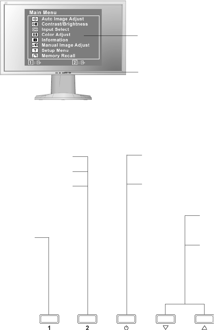 on the screen. The OSD controls are explained at the top of the next page and are defined in