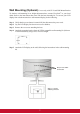 Wall Mounting (Optional) For use only with UL Listed Wall Mount Bracket To obtain a wall-mounting kit or height adjustment base, contact ViewSonic® or your local dealer. Refer to the instructions that come with the base mounting kit. To convert your LCD display from a desk-mounted to a wall-mounted display, do the following: Step 1. Verify that the power button is turned Off, then disconnect the power cord. Step 2. Lay the LCD display face down on a towel or blanket. Step 3.