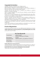Copyright Information Copyright © ViewSonic® Corporation, 2013. All rights reserved. Macintosh and Power Macintosh are registered trademarks of Apple Inc. Microsoft, Windows, Windows NT, and the Windows logo are registered trademarks of Microsoft Corporation in the United States and other countries. ViewSonic, the three birds logo, OnView, ViewMatch, and ViewMeter are registered trademarks of ViewSonic Corporation. VESA is a registered trademark of the Video Electronics Standards Association.