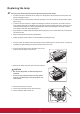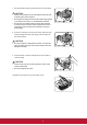 7. Use the handle to slowly pull the lamp out of the projector. CAUTION yy Pulling it too quickly may cause the lamp to break and scatter broken glass in the projector. yy Do not place the lamp in locations where water might splash on it, children can reach it, or near flammable materials. yy Do not insert your hands into the projector after the lamp is removed. If you touch the optical components inside, it could cause color unevenness and distortion of the projected images. 8.