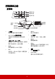控制項與功能 投影機 電源指示燈 溫度指示燈 燈泡指示燈 對焦圈 通風口 (熱空氣 散熱) 縮放圈 調整腳座 紅外線遙控感應器 投影鏡頭 • 電源 開啟投影機或切換成待機模式。 • Source 顯示來源選取列。 • / / / (梯形修正鍵) 手動修正由投影角度所造成的梯形 扭曲。 • (說明) 長按 3 秒,顯示 「說明」選單。 • • 左/ 右/ 上/ 下 螢幕顯示 (OSD) 功能表啟動時,選取所 • 需的功能表項目,並進行調整。 • Menu 開啟螢幕顯示 (OSD) 功能表。 • Exit 返回到上一個 OSD 功能表,離開並儲 存功能表設定。 5 Blank 隱藏螢幕影像。 Enter 螢幕顯示 (OSD) 功能表啟動時,執行 選取的螢幕顯示 (OSD) 項目。 • 顯示邊角調整頁面。 • Color Mode 選取可用的影像設定模式。