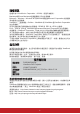 功能 自動開機 說明 訊號 選取 VGA/HDMI,允許投影機在偵測到透過 VGA/ HDMI 訊號線傳送的 VGA/HDMI 訊號時自動開啟。您也 可以選取所有,然後投影機將在收到 VGA 或 HDMI 訊號 時自動開啟。 CEC 如需詳細資訊,請參閱第 30 頁的 「使用 CEC 功能」。 直接開機 選取開啟,允許投影機在電源線通電後自動開啟。 自動關機 如需詳細資訊,請參閱第 54 頁的 「設定自動關機」。 3.