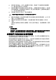 安裝除塵濾淨器 1. 2. 3. 請確認投影機已關閉,且已拔除 電源。 將濾淨器對齊右側箭頭,插入投 影機插槽。 鎖緊固定除塵濾淨器的螺絲。 2 1 3 第一次安裝: 4. 開啟 OSD 功能表,進入進階 > 濾淨器設定功能表。 5. 按下 Enter,然後會顯示濾淨器設定頁面。 6. 反白濾淨器模式並按下 / 以選取開啟。濾淨器計時器會開始計時。 只有在正確安裝除塵濾淨器 (選購配件)並使用投影機時,才需要將濾淨器模式設定為開啟。否則會 縮短燈泡壽命。 取得濾淨器使用時間資訊 1. 2. 3. 開啟 OSD 功能表,進入進階 > 濾淨器設定功能表。 按下 Enter。會顯示 濾淨器設定頁面。 您將會看見功能表上顯示的濾淨器時間資訊。 清理除塵濾淨器 1. 2. 3. 4. 請確認投影機已關閉,且已拔除電源。 鬆開固定除塵濾淨器的螺絲。 使用小型吸塵器或軟刷清理除塵濾淨器。 重新安裝除塵濾淨器。 2 1 重新設定濾淨器計時器 5. 開啟 OSD 功能表,進入進階 > 濾淨器設定功能表。 6. 按下 Enter,然後會顯示濾淨器設定頁面。 7.