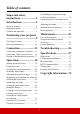 Table of contents Important safety instructions .......................2 Controlling the projector through a LAN environment ........................... 32 Using the projector in standby mode ........................................................... 39 Adjusting the sound ........................... 39 Shutting down the projector .............. 39 Menu operation.................................. 41 Introduction......................4 Projector features .................................