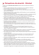 • Ne placez pas de liquides sur le projecteur, ni à proximité. Tout déversement pourrait être à l’origine d’une panne. Si le projecteur devait être mouillé, débranchez-le de l’alimentation et contactez votre service d’assistance local pour une réparation. • De l’air chaud et une odeur particulière peuvent s’échapper de la grille de ventilation lorsque le projecteur est sous tension. Il s’agit d’une situation normale et non d’une défaillance.